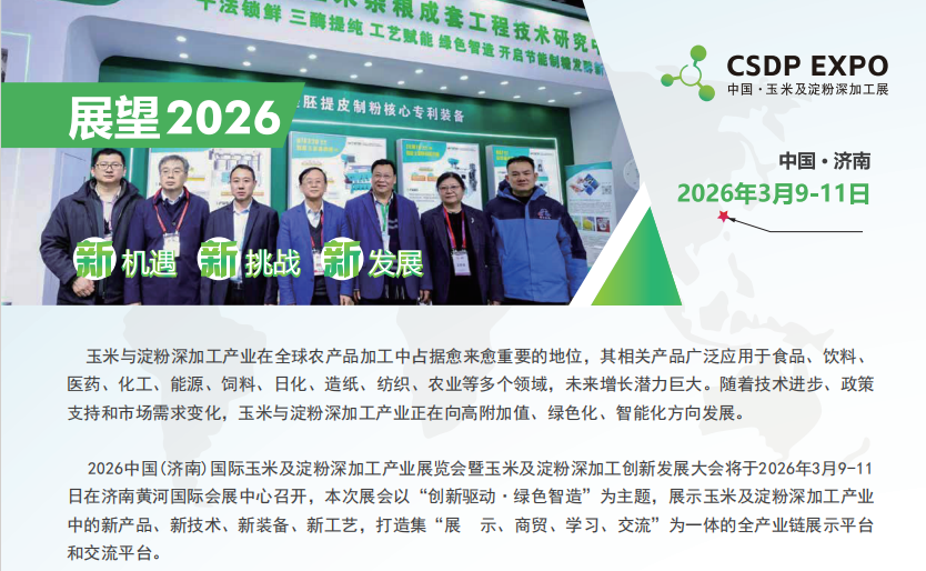 在绿色制造与智能化转型的浪潮中,洁净技术正成为玉米及淀粉深加工行业高质量发展的关键支撑。2026年3月9日至11日,2026中国(济南)国际玉米及淀粉深加工产业展览会(CSDP EXPO 2026)将在济南黄河国际会展中心盛大举办。本届展会以“创新驱动·绿色智造”为主题,聚焦玉米深加工全产业链,特别设立“洁净技术与设备”专区,集中展示洁净室、灭菌设备、净化系统等前沿技术与装备,助力行业迈向更高标准的洁净生产新时代。
