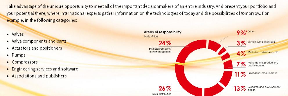 德国阀门世界博览会是世界范围内唯一专业性的阀门展,由业内深具影响的专业荷兰“阀门世界”及其母公司KCI 自1998 年开始举办,每两年一届,地点设在荷兰马斯特里赫展览中心。从2010 年11 月起,阀门世界博览会迁至德国杜塞尔多夫。在2010 年,阀门世界博览会第一次在新的地点杜塞尔多夫举行。贸易参观者从都使用阀门技术的造船部门,汽车和汽车工程,化工,电力供应业,海洋和近海工业,食品加工业,机器和工厂建设等,他们都将齐聚在这次阀门世界博览会上。阀门世界博览会近几年的不断发展不仅增加了参展商及参观者的数量,同时还刺激了不断扩大展位面积的需求。